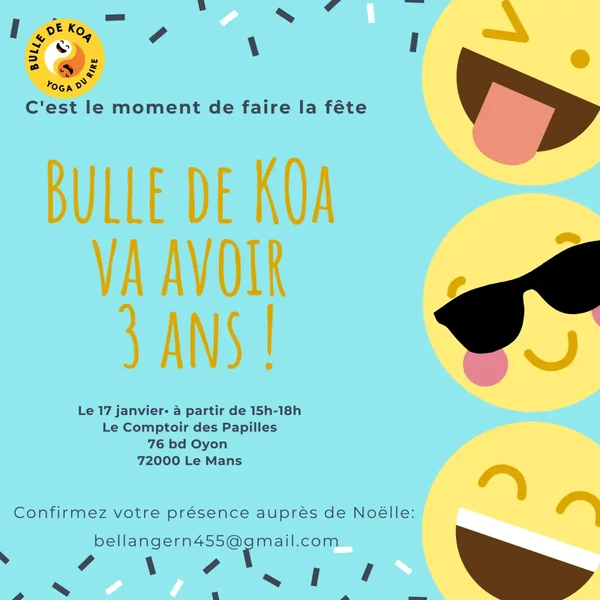Bonjour à tous ! Je m'appelle Noëlle Bellanger, et je suis ravie de vous présenter mon entreprise de Yoga du Rire, appelée Bulle de Koa (qui signifie Joie en Maori).